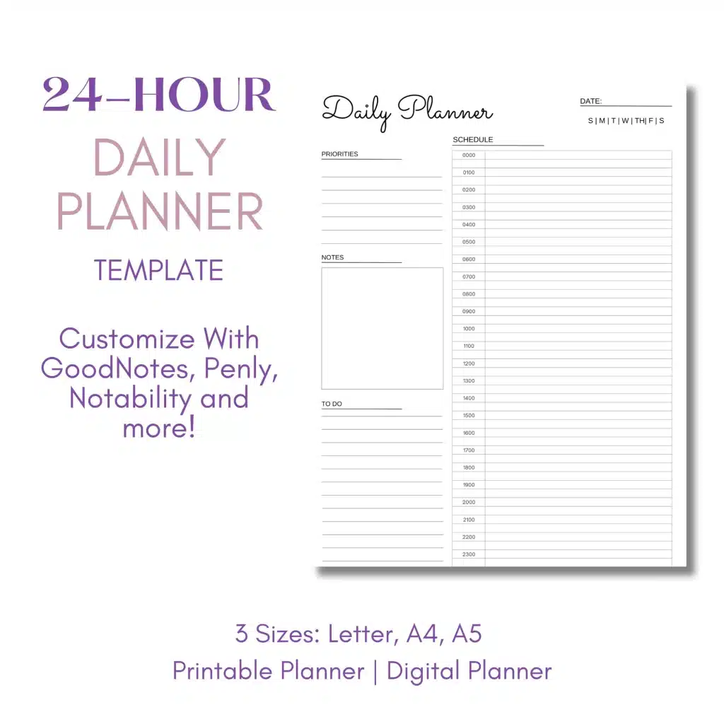 - A Versatile Daily Planner: An undated, dual-column layout featuring a 24-hour schedule on one side and a section for goals, notes, and to-do lists on the other.